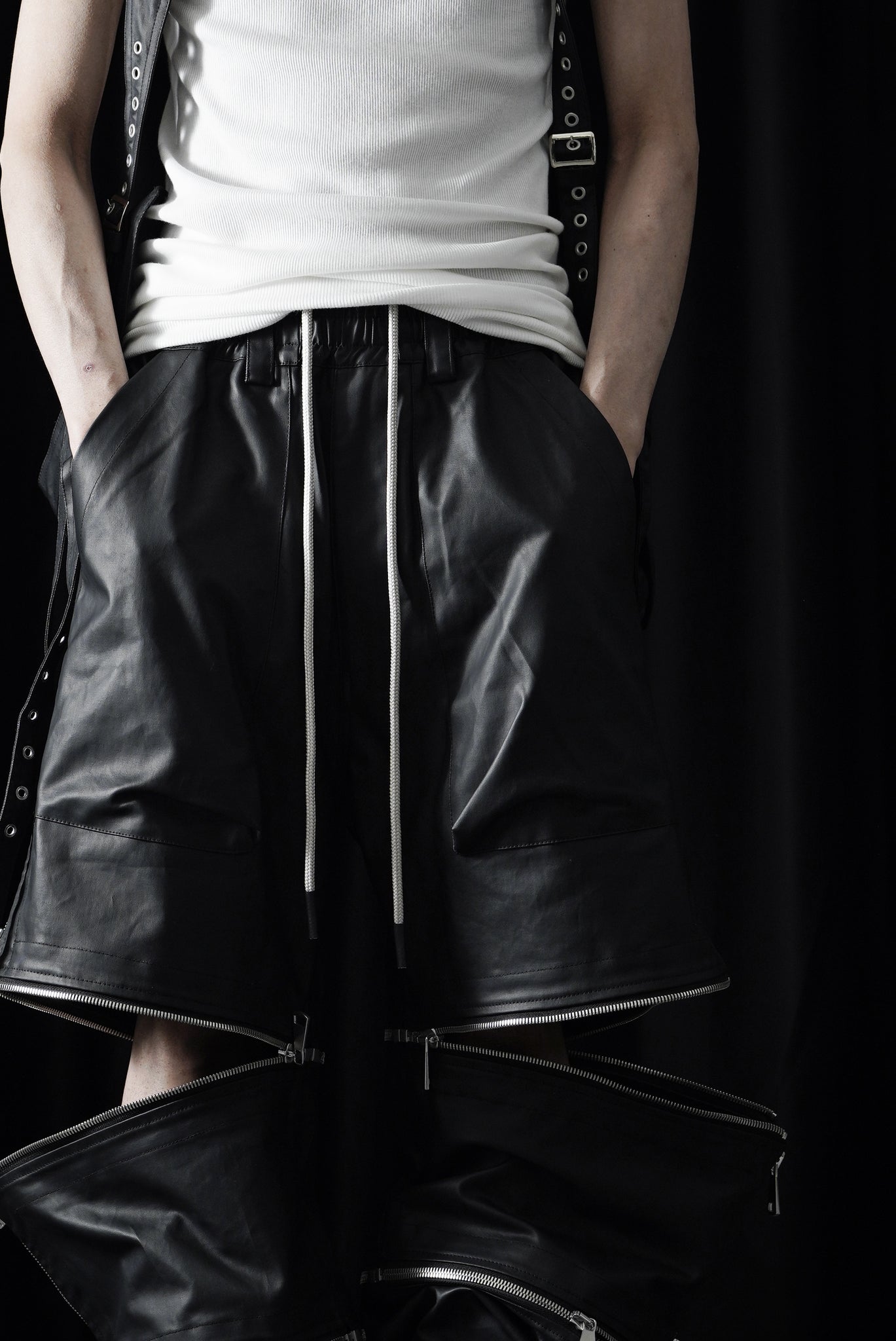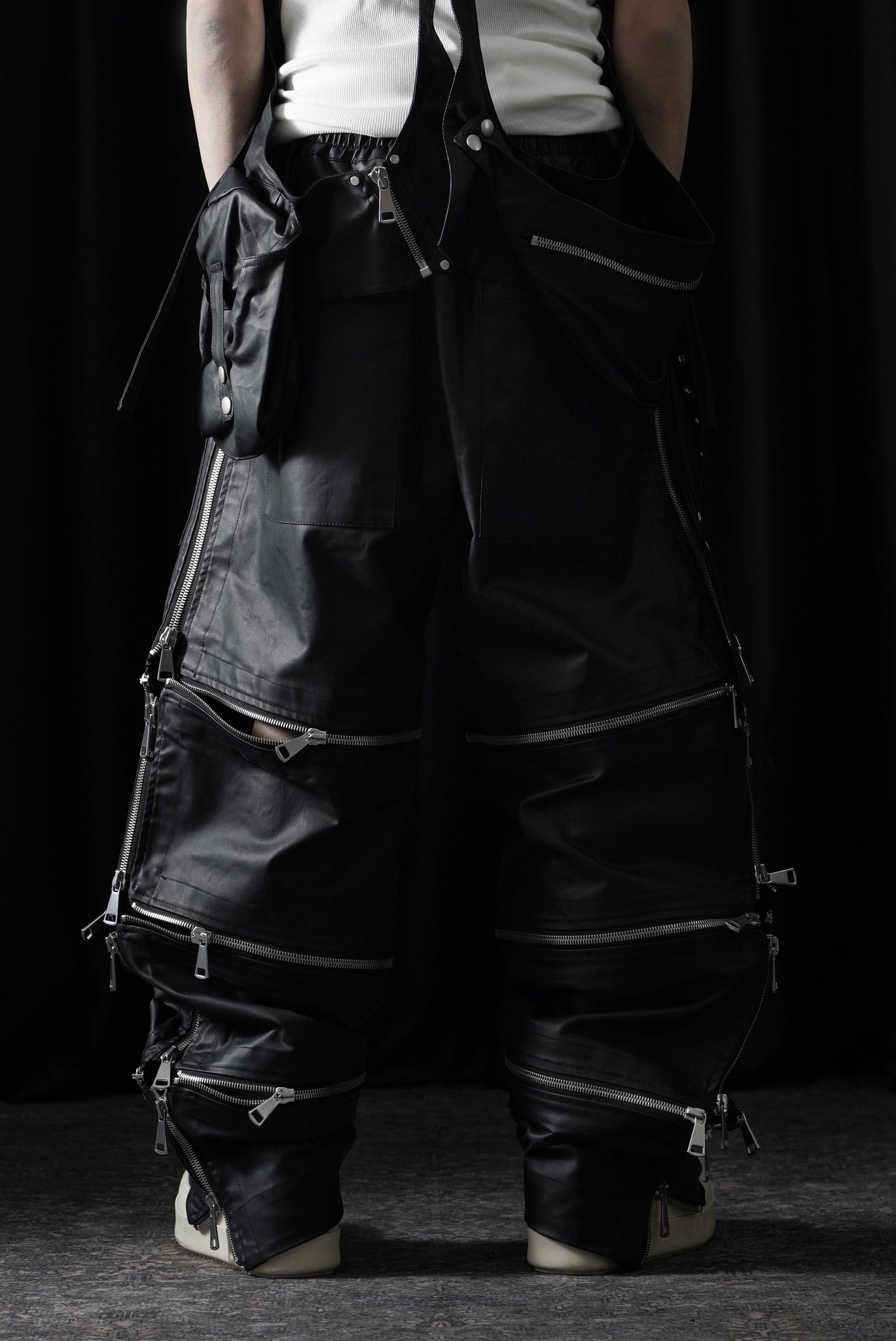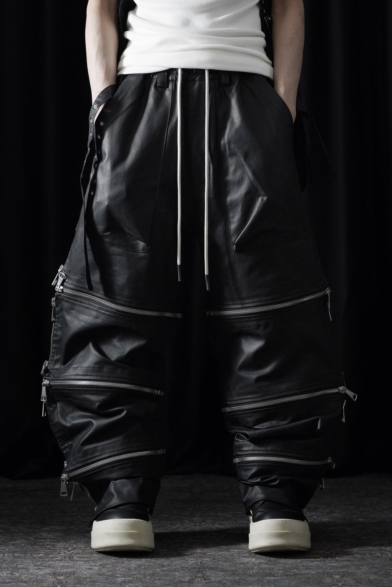 ・A.F ARTEFACT 26SSより、多数のジップを配したワイドパンツ。