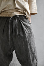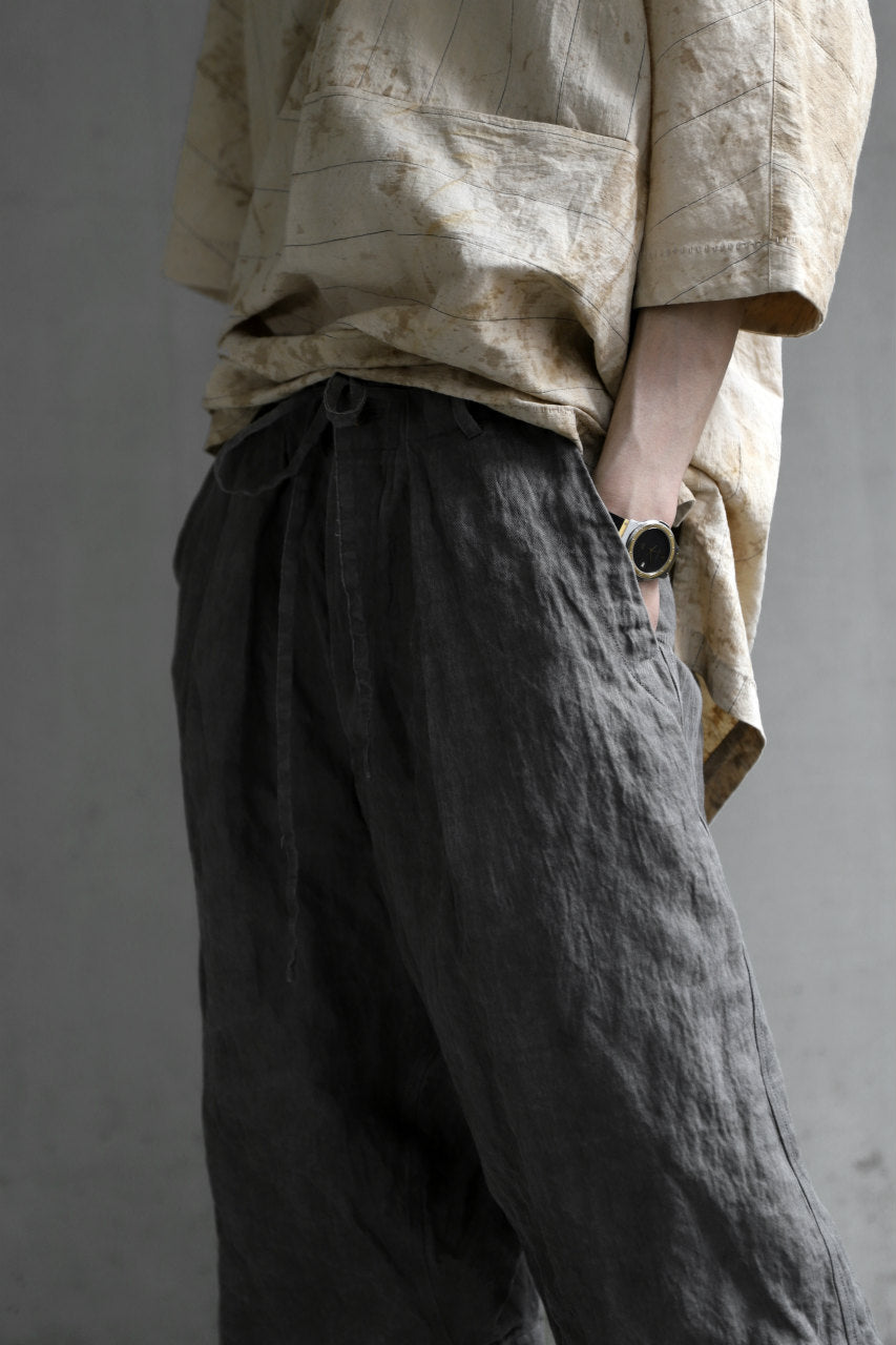 ・コットン/ラミー/メタルのブレンド生地を斑染し、絶妙な綾織の斜向と陰影感を表現