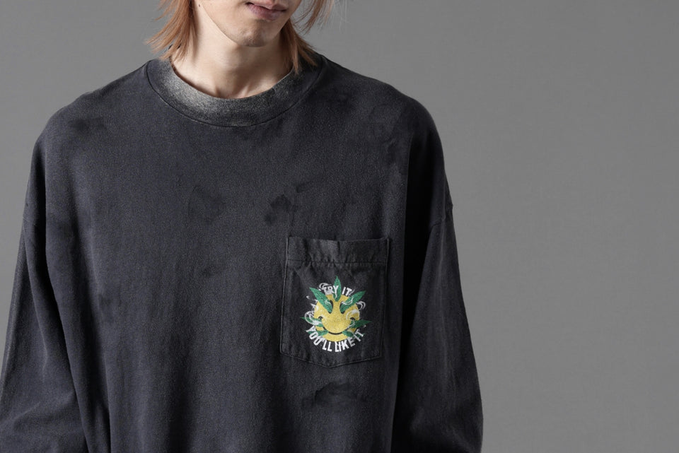 ・左胸元のポケットに、スマイルに麻の葉を絡ませた独特のプリント