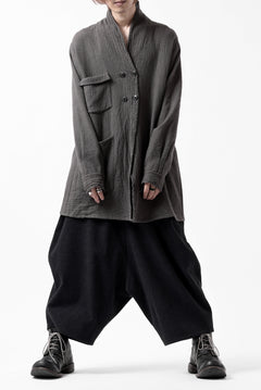 ・首に捲き付くかの様なラペルレス、フラップやパッチのデザインポケット