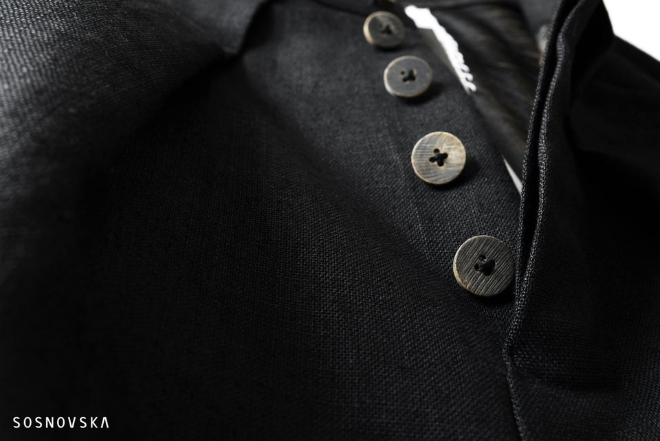 釦はSOSNOVSKAオリジナルを採用し、しっかりと手巻きで直立させています。