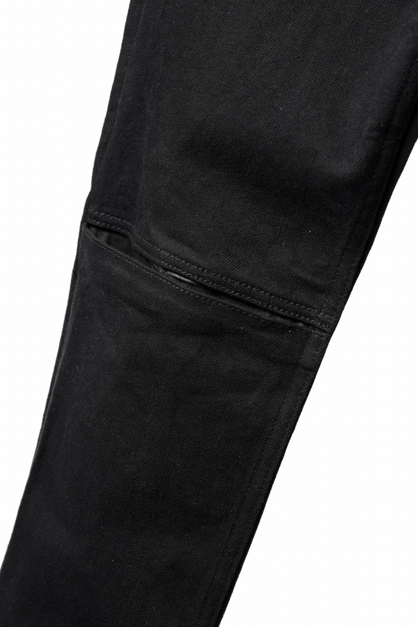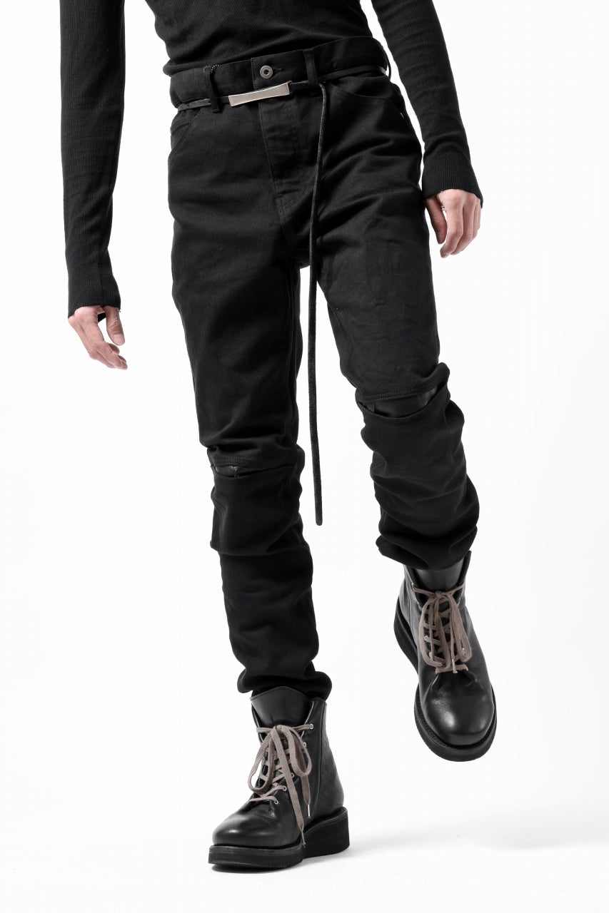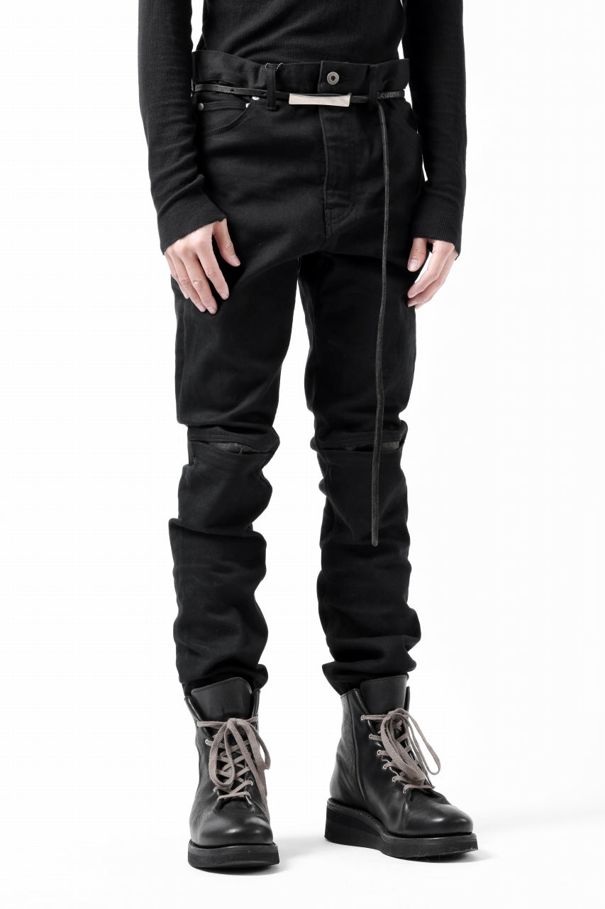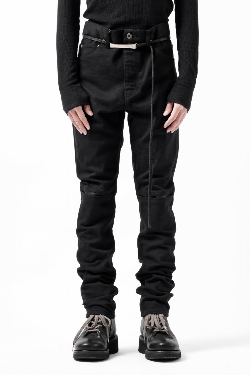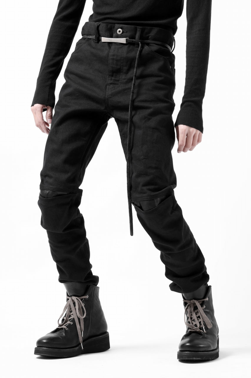 ISAMU KATAYAMA BACKLASH BLACK LEATHER KNEE PADS SLIM PANTS / "京都紋付 - 漆黒染" 13oz STRETCH DENIM (BLACK)