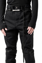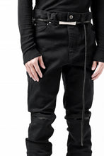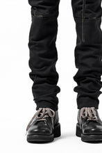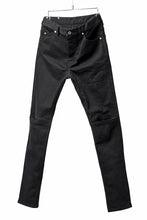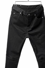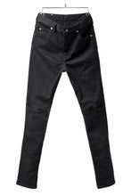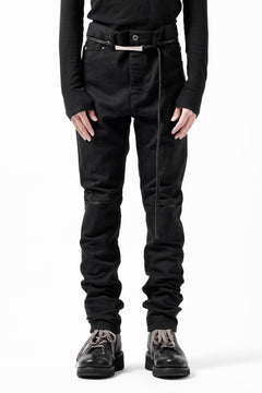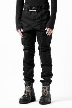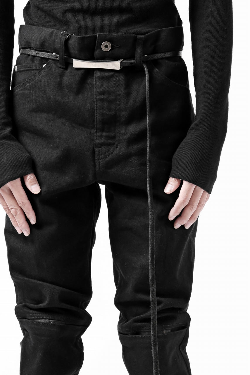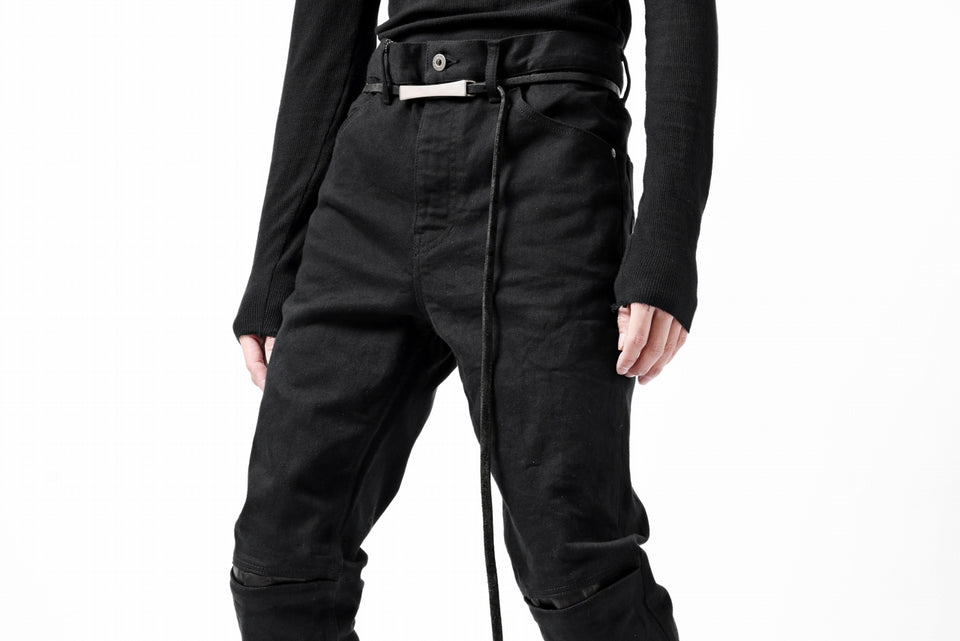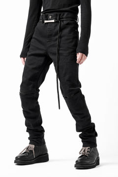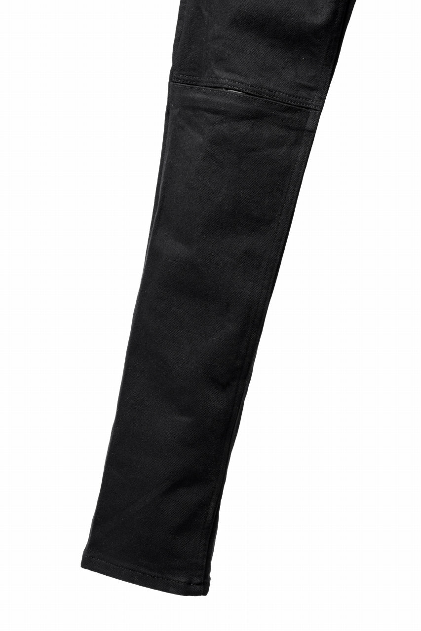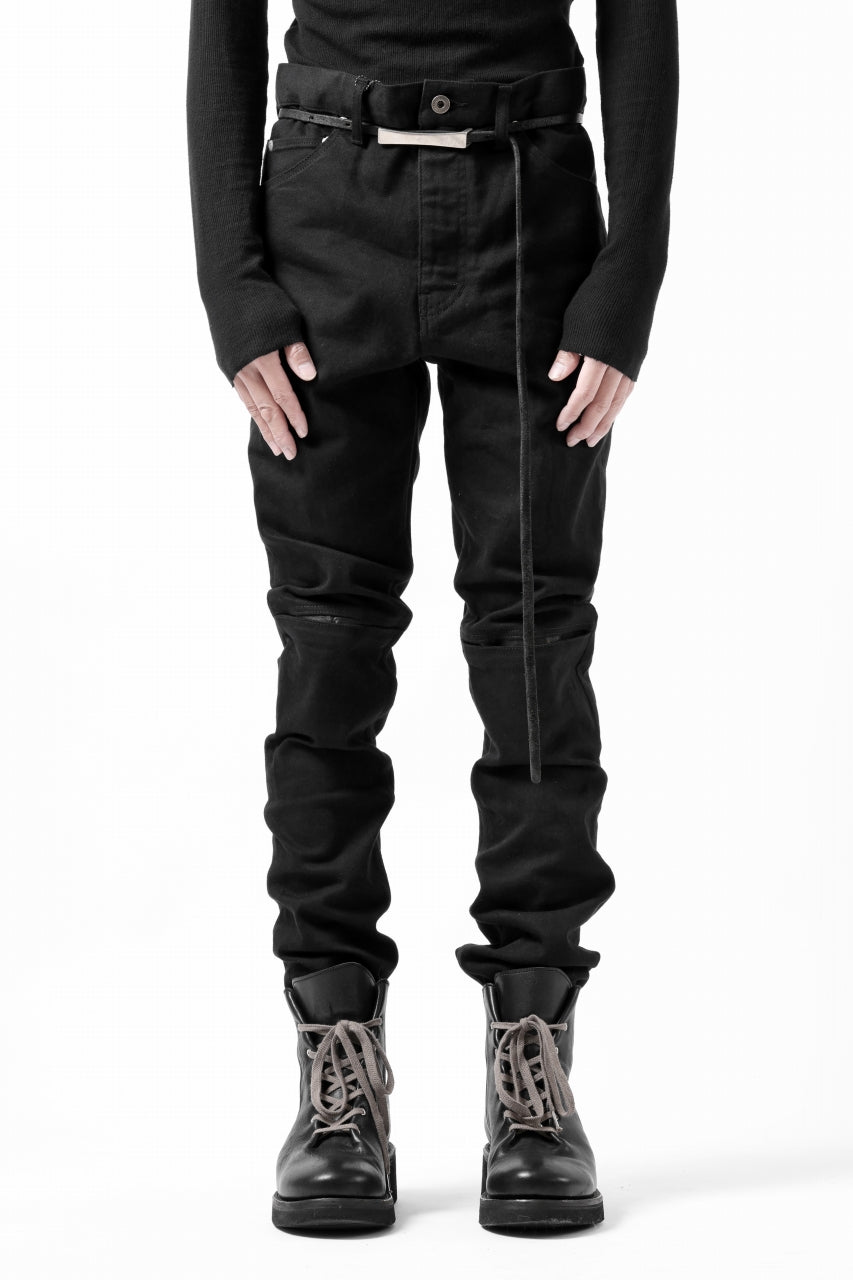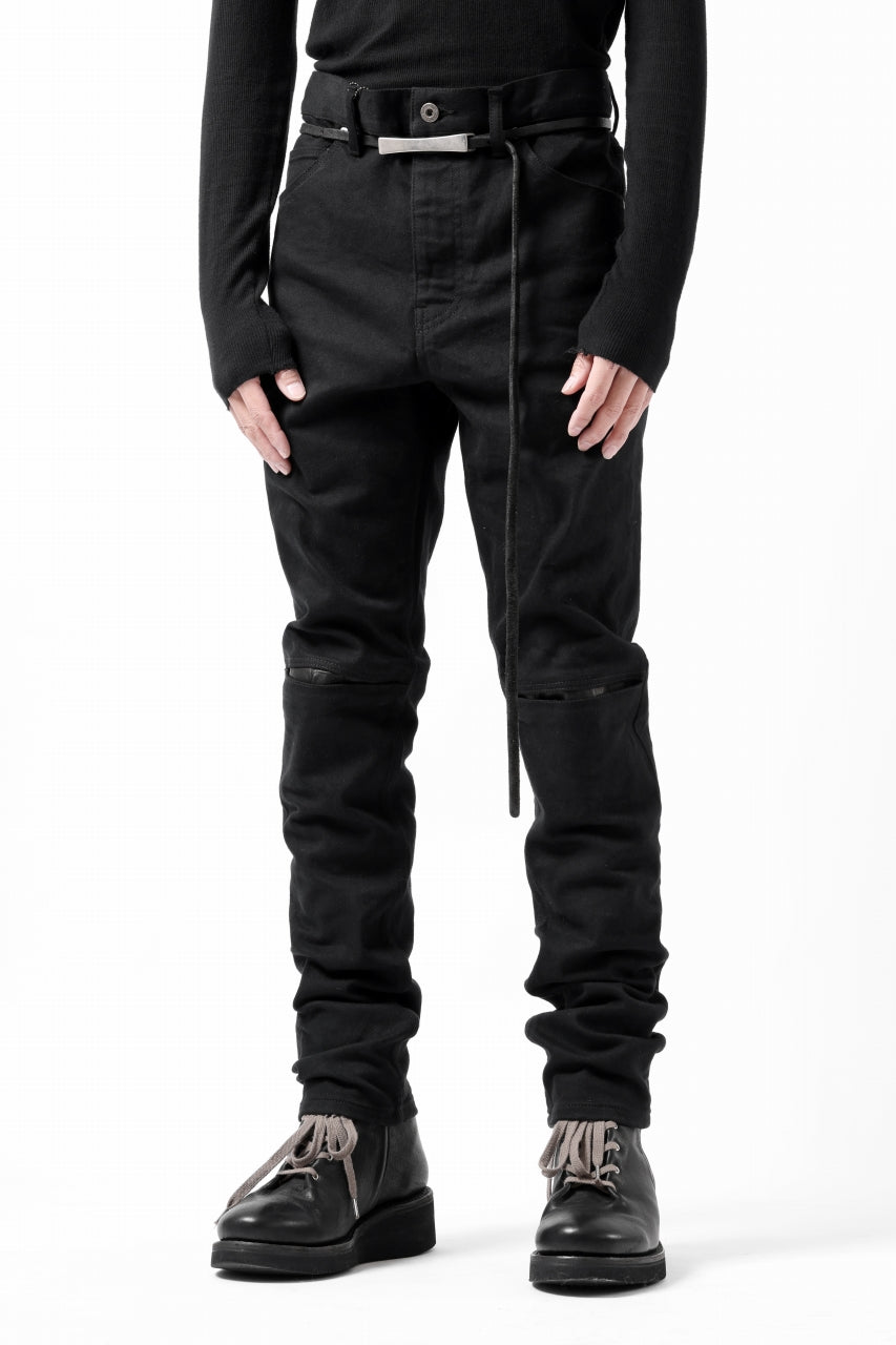 ISAMU KATAYAMA BACKLASH BLACK LEATHER KNEE PADS SLIM PANTS / "京都紋付 - 漆黒染" 13oz STRETCH DENIM (BLACK)