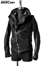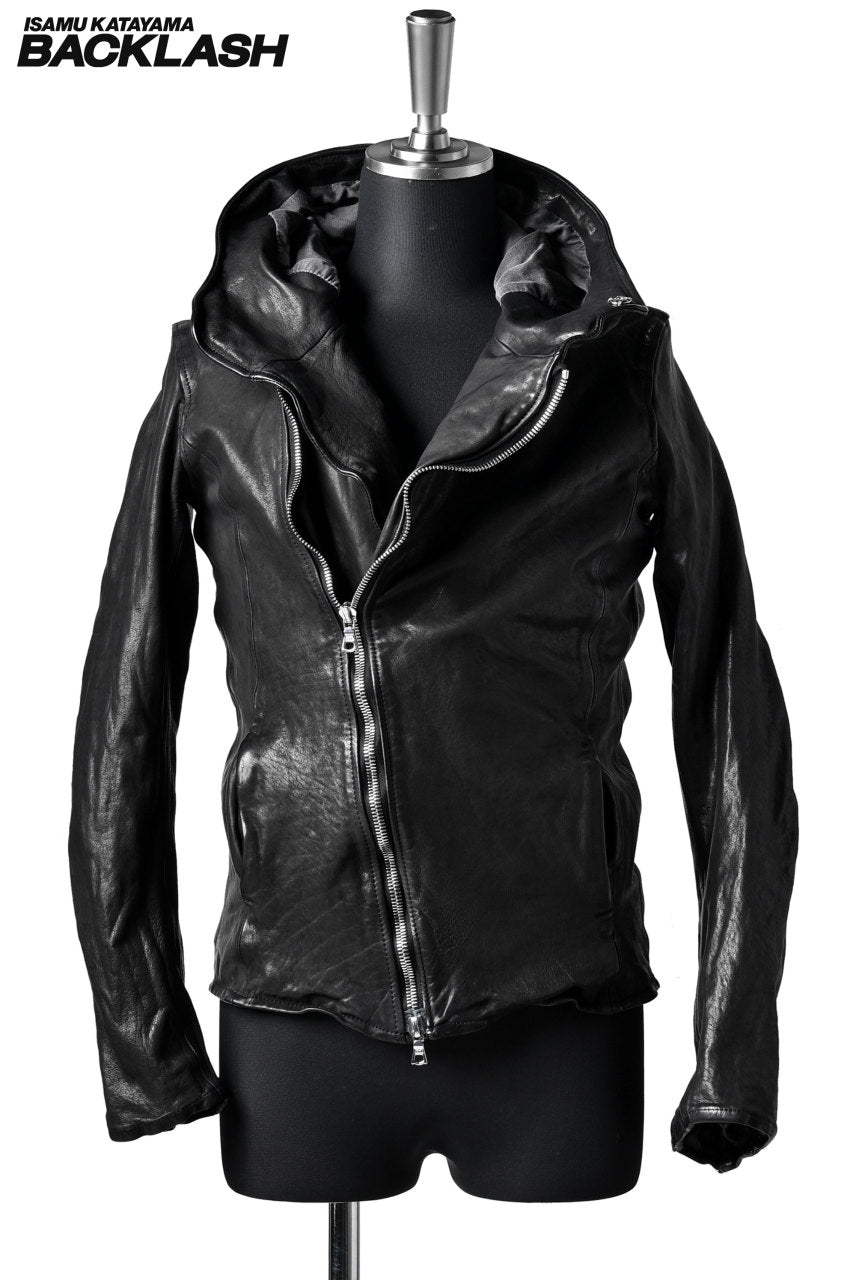 曲線を描くバイアスフロント、ハイネック+フードデザインのレザージャケット。