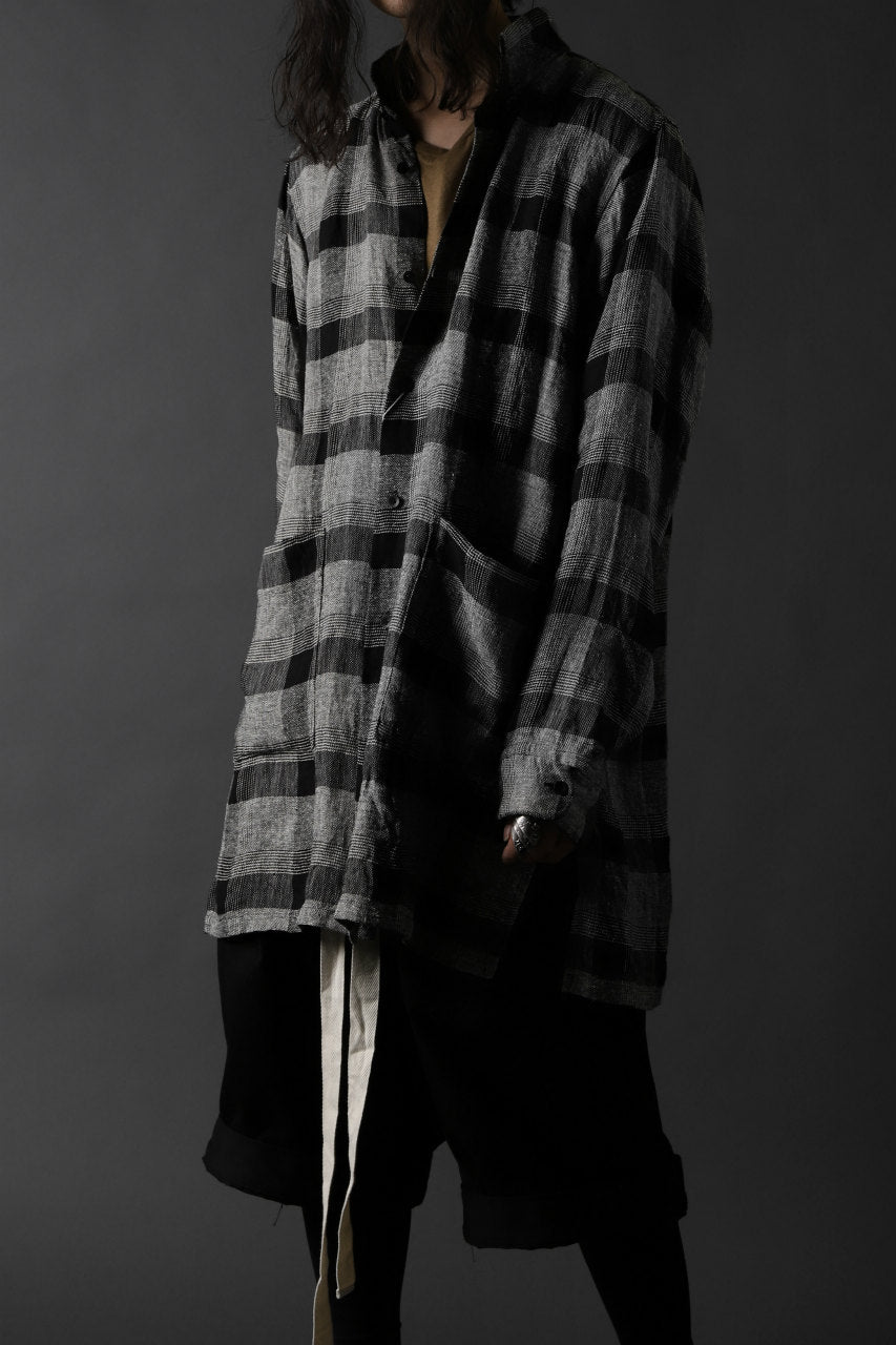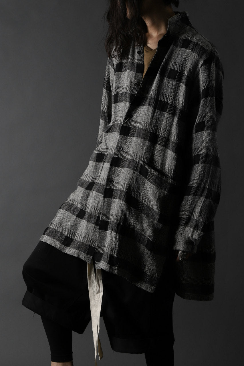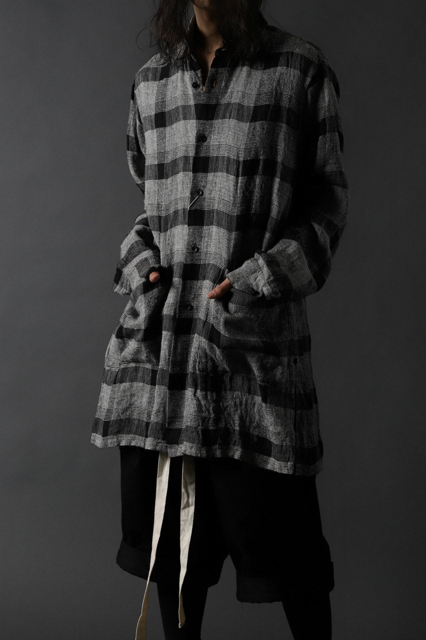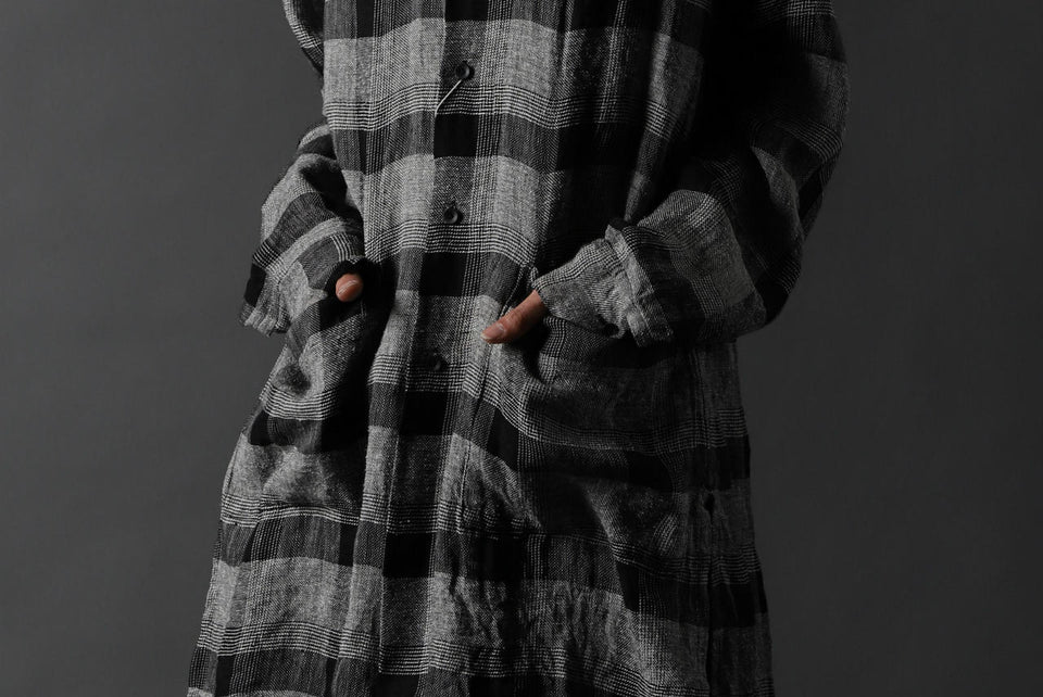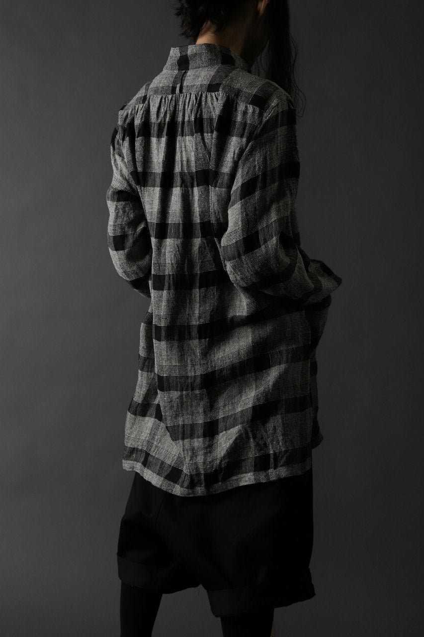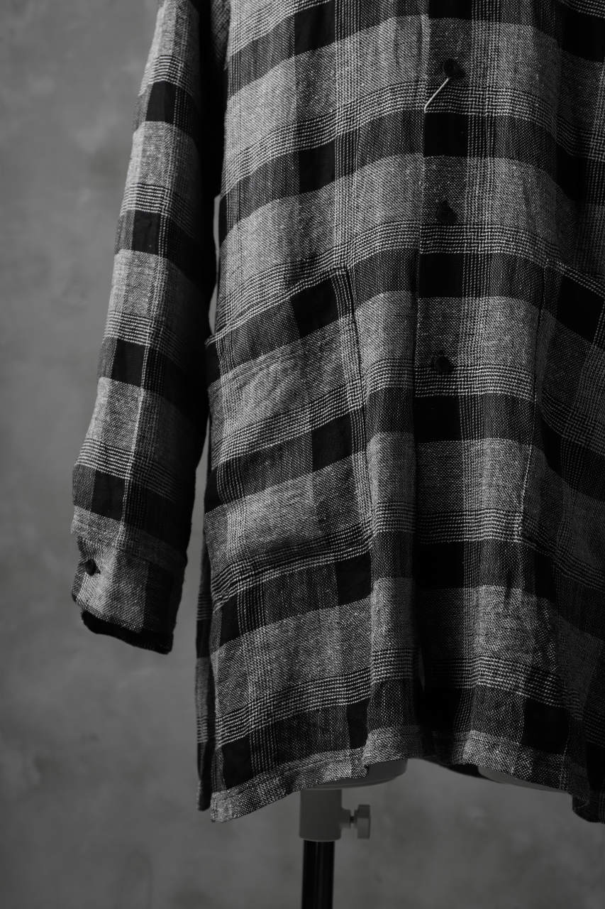 襟元や袖口、そして裾口にそれぞれ段差を設けて、チェック柄と共に能動的なフォルム。