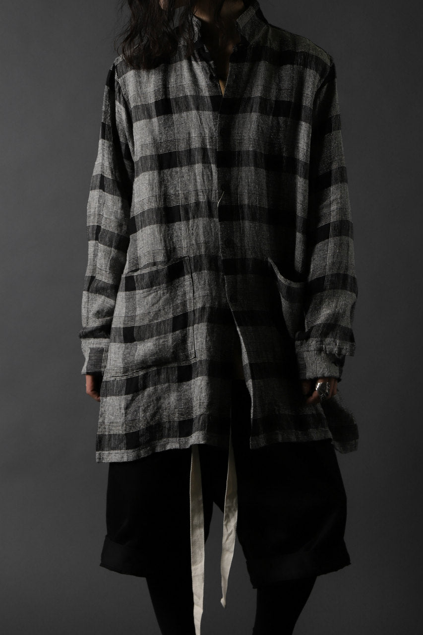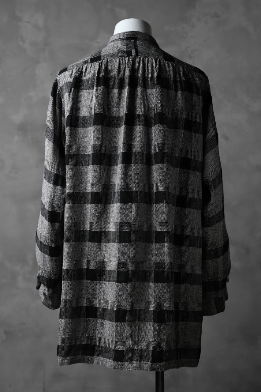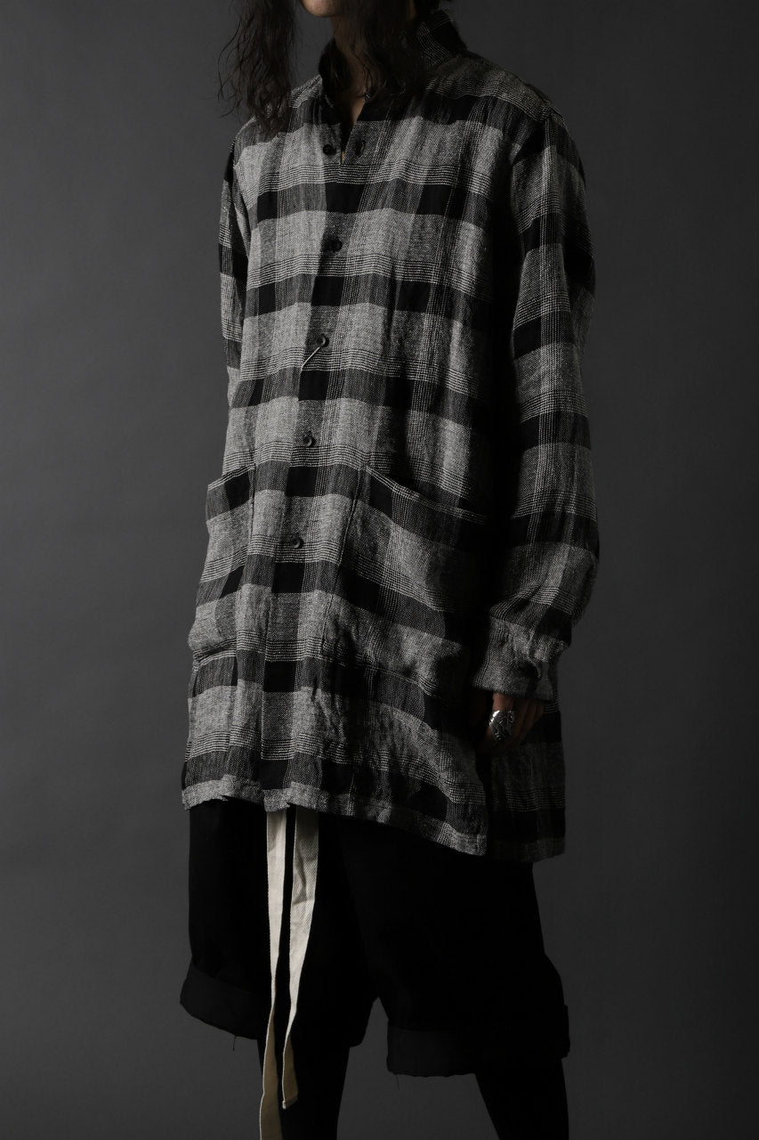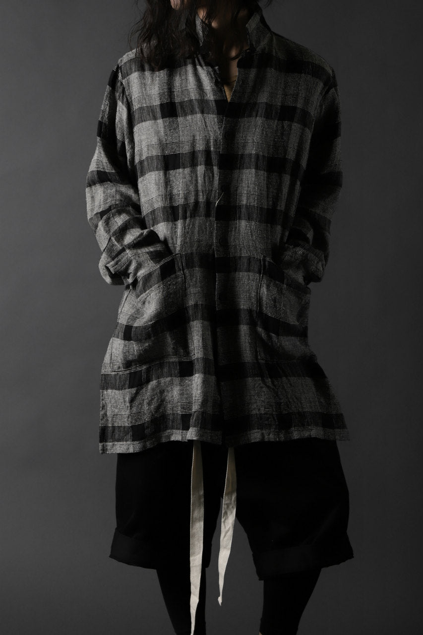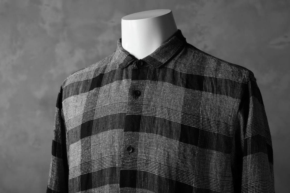 襟元や袖口、そして裾口にそれぞれ段差を設けて、チェック柄と共に能動的なフォルム。